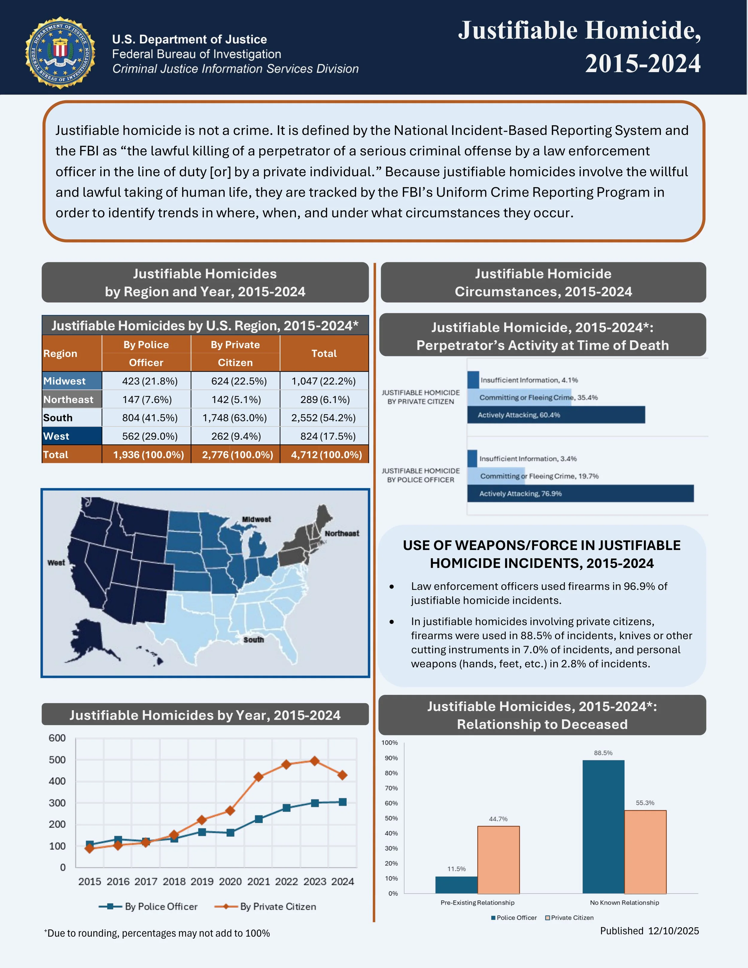 Here is the latest FBI report on justifiable homicides in the US, both by police and by private citizens.